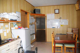 休憩室は8畳で、流しやテレビや電子レンジや冷蔵庫、夜食や飲みのもがあり、夜のお産時の待機場所として、または食事会にも利用します。