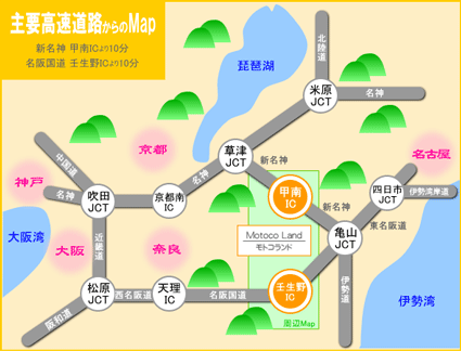 名阪国道 「壬生野IC(阿山・信楽)」下車10分です。 インターチェンジからは一本道ですので、とても分かりやすいです。 途中に「道の駅 あやま」があります。 ジャパンクラシックカントリー倶楽部の近くでもあります。 新名神高速道路「甲南IC」下車10分。 ※甲南PAに入らないでください!入ると「甲南IC」で下りれません。 参考:名阪国道路々線面・道路状況情報 (国土交通省中部地方整備局) ※Webカメラで現在の状況が確認できます。